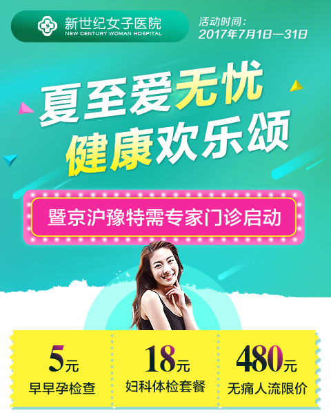 夏至爱无忧 健康欢乐颂 2017-06-30 16:15:16 172人觉得有用 温馨提示:文字太多?直接咨询在线医生免费咨询 前言:2017年7月1日至7月31日,郑州新世纪女子医院推出“夏至爱无忧 健康欢乐颂”——暨京沪豫特需专家门诊启动活动,向全城征集妇科疑难病症患者。活动期间会送出7项优惠“欢乐颂”,包含妇科检查5元起,私处护理50元,人流限价480元,私密整形手术半价、征集项目手术费半价等惠民活动,为河南女性健康保驾护航。 主办单位:郑州新世纪女子医院 活动时间:2017年7月1日-7月31日 活动内容: 已有680患者看完本文章后 参与咨询 上一篇:品质医疗 年中钜惠 下一篇:2018“京沪豫名医堂”专家会诊平台正式落户郑州新世纪女子医院 相关热点问题 +更多 2018“京沪豫名医堂”专家会诊平台正式详情>> 河南首个“京沪豫名医堂”正式启动,详情>> 郑州新世纪女子医院宣誓发声:诚信详情>> 郑州慈善总会“慈善志愿者服务站”落详情>> 夏至爱无忧 健康欢乐颂详情>> 评论评价 立刻咨询